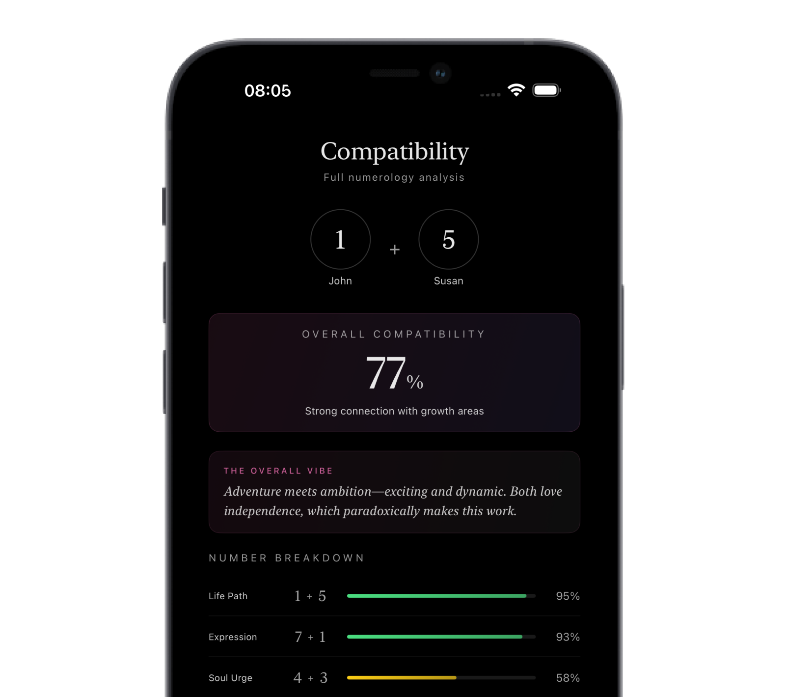 Going beyond simple matching. Our advanced algorithm analyzes both partners' numerological profiles to reveal your relationship dynamics, strengths, and growth areas. See how your numbers dance together.